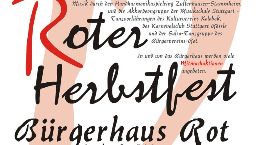 Auch in diesem Jahr veranstaltet der Bürgerverein Stuttgart-Rot sein alljährliches beliebtes Roter Herbstfest mit vielen teilnehmenden Gruppen im Bürgerhaus Rot.