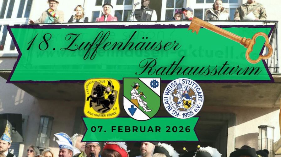 Am Samstag, 7. Februar, steht der Flecken wieder ganz im Zeichen der Fasnet. Zum Rathaussturm und anschliessendem Fastnachtstreiben laden die IG Zuffenhäuser Fasnet sowie die beteiligten Karnevalsvereine alle Zuffenhäuserinnen und Zuffenhäuser herzlich ein!