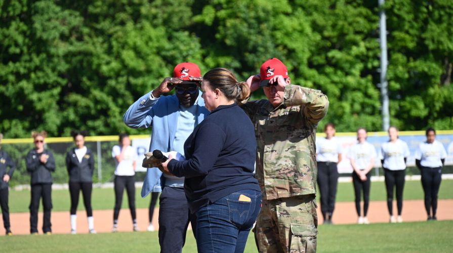 Bezirksvorsteher Gueye und Colonel Alexander warfen ersten Ball beim Spiel Stuttgart Panthers vs. Ramstein Royals