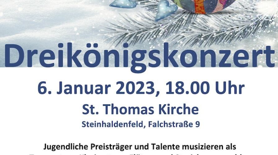 Am Freitag, den 6. Januar 2023 findet um 18 Uhr in der katholischen St.-Thomas-Kirche in Stuttgart-Steinhaldenfeld das diesjährige Dreikönigskonzert statt. Jugendliche Preisträger und Talente musizieren als Trompeten-, Klarinetten- und Streicherensembles sowie als Solisten.