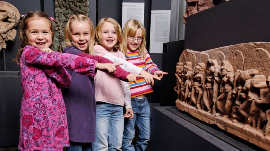 Foto: Junge Besucherinnen in der Südasien-Abteilung des Lindenmuseums Stuttgart. Foto: Kultur für alle Stuttgart