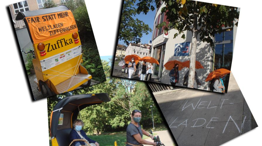 Margret Lehmann vom Zuffenhäuser Weltladen in der Besigheimer Straße 19 hat für ihren Aktionstag im Rahmen der "Fairen Woche" 2020, der bundesweit größten Aktionswoche des Fairen Handels (11. bis zum 25. September) die Idee, dieses neue "Zuffenhäuser Wahrzeichen auf drei Rädern" einzusetzen: "Wir haben für unseren Aktionstag am 19. September die Idee gehabt, die Zuffka zu bestellen, die zwischen Weltladen und Marktplatz pendelte und Besucher kostenlos hin- und her transportierte. Zudem haben wir mit Tafelkreide Wegweiser zum Weltladen gemalt und waren mit orangenen Schirmen unterwegs."