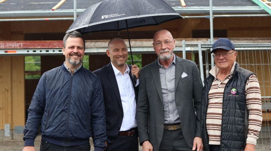 Bei leichtem Nieselregen gab Zimmermeister Glemser (Fa. Rikker) vom Dach des schmucken Gebäudes seinen „Segen“. Eine kleine erlesene Schar von Ehrengästen verfolgte die schlichte Zeremonie, die passender Weise mit alkoholfreiem Bio-Fruchtsaft vollzogen wurde. Mit dabei neben den beteiligten Handwerkern auch Grünen-Stadträtin Silvia Fischer und Angelika Sauer (CDU) vom Bezirksbeirat sowie Volksbank-Vorstand Eric Hartung und als „Stargast“ kein Geringerer als Porsche-Betriebsrat a.D. Uwe Hück.