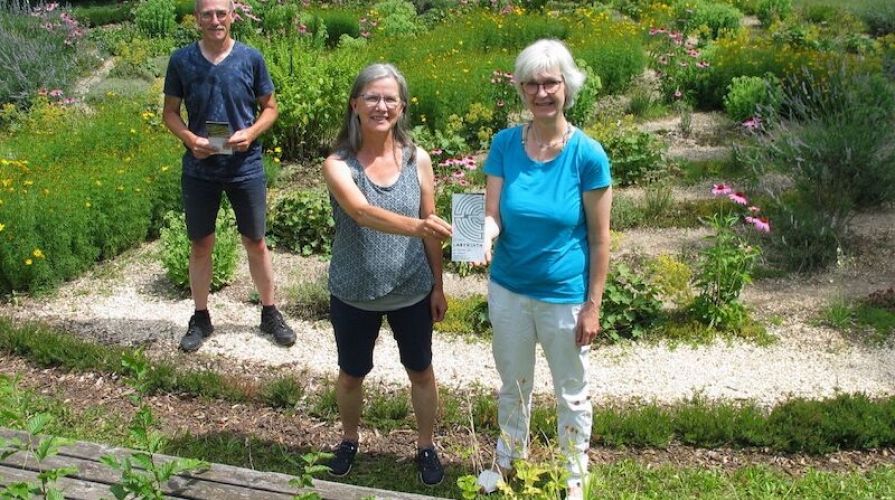 Die Stauden blühen, Wildbienen und Schmetterlinge schwirren und die Lavendel, Thymian & Co duften verführerisch – das Labyrinth ist gerade eine Erfahrung für alle Sinne. „Aber eigentlich es zu jeder Jahreszeit schön“, sagt Barbara Meiser und Mechthild und Michael Schiewe nicken zustimmend. Meiser gehört von Anfang an zum Labyrinth-Team und das Ehepaar Schiewe kümmert sich mit Hingabe um die Pflanzen des Labyrinths. Man wohne ganz in der Nähe, da ist es nur ein kurzer Weg um nach dem Rechten zu schauen, so erzählen sie. Dafür gibt es eine Gießplan, der jetzt aber weniger streng ausfällt. „Als wir noch rein mit Tagetes bepflanzt hatten, da mussten wir auch täglich gießen, mit den Stauden ist es einfacher geworden“, erklärt das Grüppchen.
