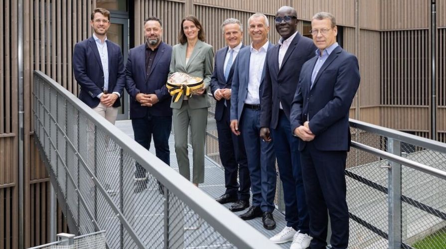 Till Bremen, Geschäftsführer KinderHut GmbH, Ibrahim Aslan, Vorsitzender Betriebsrat Zuffenhausen, Vera Schalwig, Vorständin für Personal- und Sozialwesen, Dr. Frank Nopper, Oberbürgermeister der Landeshauptstadt Stuttgart, Albrecht Reimold, Vorstand für Produktion und Logistik, Saliou Gueye, Bezirksvorsteher Zuffenhausen, Christoph Bohrer, Kaufmännischer Geschäftsführer Wolff & Müller Hoch- und Industriebau GmbH & Co. KG (l-r), Betriebskindertagesstätte (Kita), Stuttgart-Zuffenhausen, 2025, Porsche AG