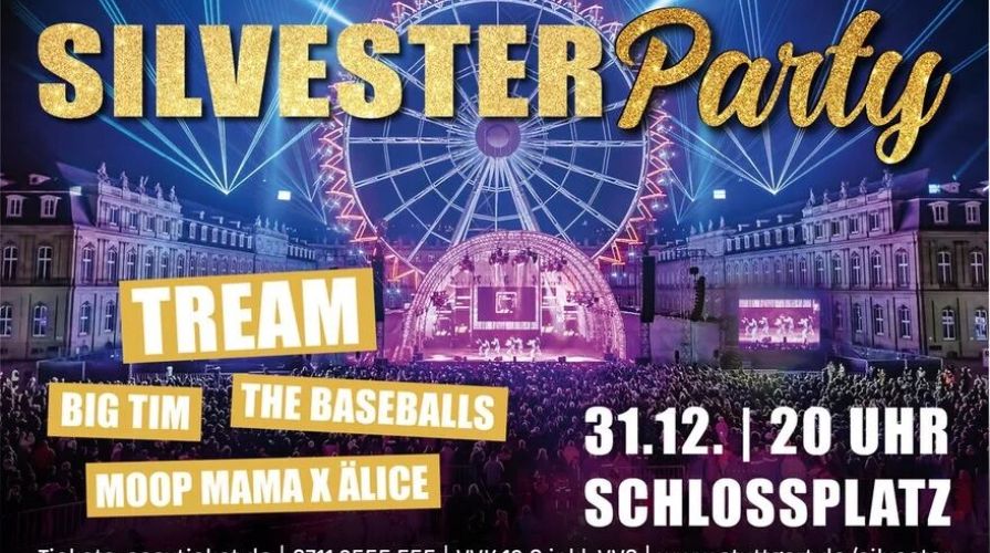 Kurz vor Mitternacht sorgen Trompeter Kevin Pabst und Tenor Jay Alexander mit „You’ll never walk alone“ und „Freude schöner Götterfunken“ für einen Gänsehautmoment, bis schließlich der Countdown in Richtung Mitternacht beginnt. Dann läutet ein gigantisches Licht‐ und Laserspektakel mit Feuereffekten das neue Jahr 2025 ein. Dabei wird der gesamte Schlossplatz eingebunden, vom Neuen Schloss über die beiden Brunnen bis hin zur Jubiläumssäule.