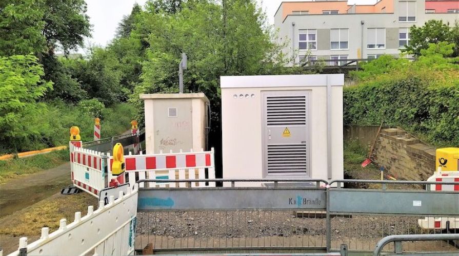 Foto: Die neue Umspannstation im Wohngebiet „Hohlgrabenäcker“, die in den nächsten Monaten ans Stromnetz angeschlossen wird.