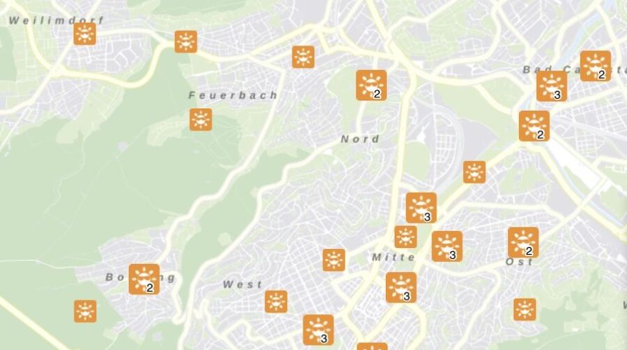 Die Karte der kühlen Orte enthält eine Vielzahl von Stellen in der Stadt, an denen es weniger warm ist im Vergleich zu ihrer Umgebung: wie etwa Stadtteilbibliotheken, Spielplätze, Grünanlagen und Gewässer. Dafür hat die Abteilung Gesundheitsförderung der Stadt auch viele Ratschläge von Stuttgarterinnen und Stuttgartern zusammengestellt, die ihre guten Tipps für kühle und schattige Plätze mit der Allgemeinheit geteilt haben.